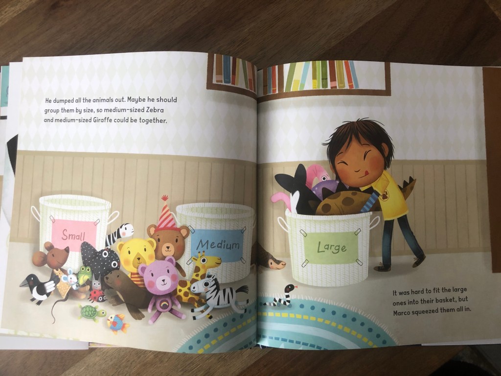 Written by Sara Levine and illustrated by Marta Álvarez Miguéns, The Animals Would Not Sleep! tells the story of Marco’s bedtime woes. Marco must pick up his stuffed animals before bed. However, the stuffed animals are not happy with how Marco has sorted them into their baskets. Marco explores different sorts in the hopes everyone can peacefully go to bed.