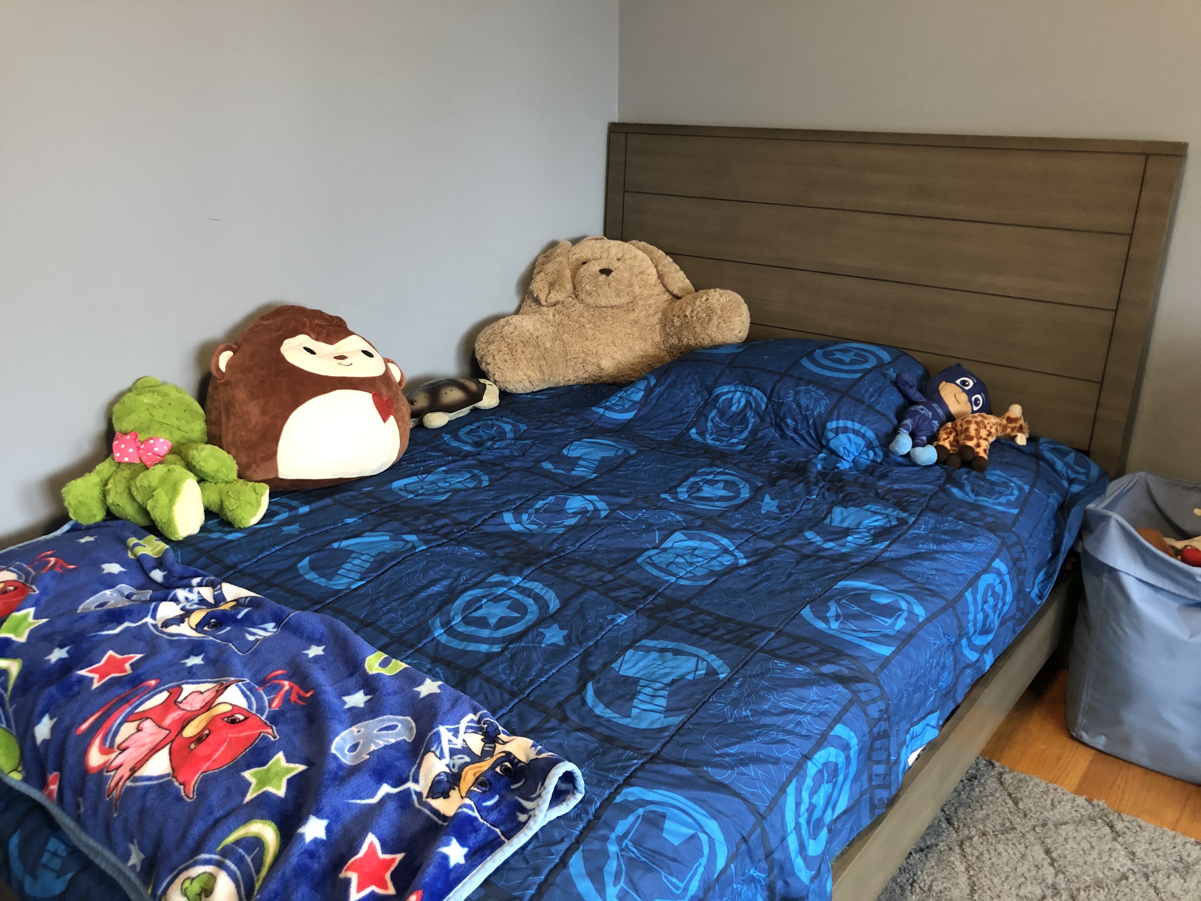 The magic of this book lies in pairing a mathematical content with something many children adore. Carrie Finison did it with doughnuts here. And Sara Levine does it with stuffed animals. As a kid, I carefully arranged my stuffed animal at the head of my bed and my children do the same now. Here is a photo of Landon’s bed and my daughter Siena’s bed.